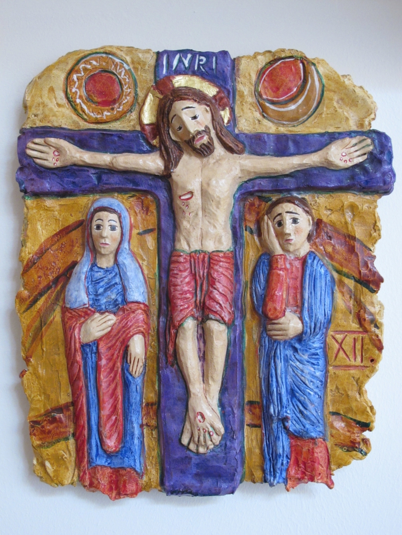 Über dem Altar ist ein großes aus farbig gefasster Keramik hergestelltes Kreuz, angebracht. Maria und Johannes ergänzen dieses Kreuz zur Kreuzigungsgruppe. Der Apostel Johannes ist figürlich einer Johannes-Figur aus dem Domschatz nachempfunden.