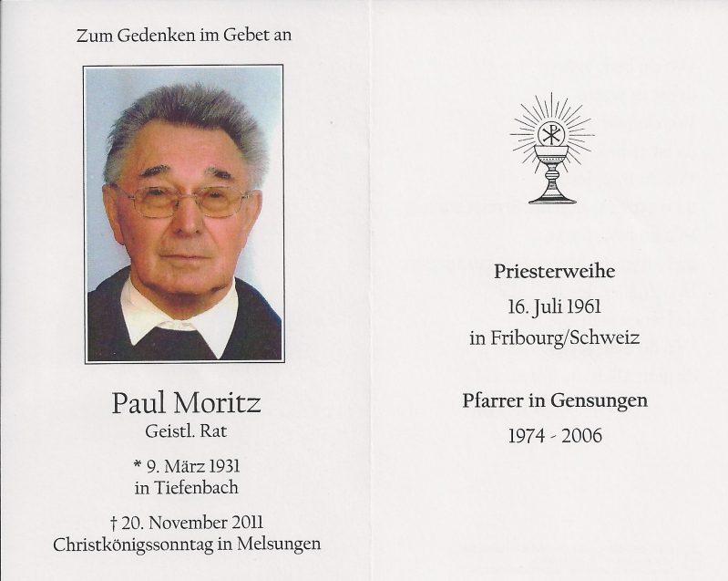 Am Samstag, dem 26. November 2011 haben wir Pfarrer i.R. Paul Moritz in Gensungen zu Grabe getragen. Hauptzelebrant bei dem feierlichen Requiem in der Pfarrkirche Mariae Namen war Weihbischof Johannes Kapp. In Prozession ging es danach zum Friedhof. Die Beerdigung war Aufgabe von Herrn Dechant Jörg-Stefan Schütz.
