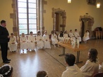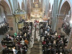 Die Erstkommunionkinder trafen sich um 9.15 Uhr im Stiftssaal. Dort gab es noch ein paar beruhigende Worte von Herrn Pörtner und Herrn von Keitz und dann konnte es losgehen. Herr Kaplan Kämpf kam und holte die Kinder zum Einzug in den Dom ab. Der Bläserchor begrüßte die Kinder musikalisch. Leider spielte das Wetter nicht ganz mit, so dass Herr Kaplan auf kürzestem Weg mit den Kindern in den Dom steuerte.