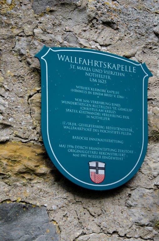 Nach dem sehr interessanten Aufenthalt in der Gedenkstätte und einer kleinen Stärkung ging es an den Fuß des Gehilfersberges. Leider hatte es zu regnen begonnen, was die Wallfahrer jedoch nicht davon abhielt mit den mitgebrachten Kolpingbannern den nicht allzu weiten aber teilweise doch steilen Weg zur Gehilfersbergkapelle zu bewältigen. Die der Heiligen Maria und den Vierzehn Nothelfern geweihte Wallfahrtskapelle wurde um 1625 errichtet und war im 17. und 18. Jahrhundert der bedeutendste Wallfahrtsort des Hochstifts Fulda. Im Mai 1996 wurde die Kapelle durch Brandstiftung vollständig zerstört und anschließend originalgetreu wieder aufgebaut.