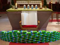 Dass es gut tue, Sorgen mit Gott und den Menschen zu teilen, war das Thema der Ansprache, mit der Schulpfarrerin Jung die neuen Schülerinnen und Schüler begrüßte. Der knuffige Sorgenfresser, den sie mitgebracht hatte, zeige aber ihrer Erfahrung nach wenig Wirkung, wie sie glaubhaft versicherte. Entlastung bringe es, die Sorgen vor Gott zu tragen, was die Kinder taten, indem sie für sich und ihre Familien symbolhaft Steine am Altar ablegten. Während der Steinhaufen also im Verlauf der vier Aufnahmegottesdienste wuchs, nahm der Stapel an Bibeln allmählich ab, denn nach der Segnung